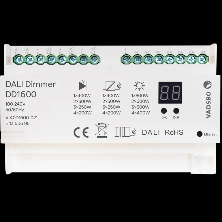 DD1600 on 4-kanavainen DALI-vaihehimmennin takareunan himmennyksellä. Tukee resistiivisiä ja kapasitiivisia kuormia.