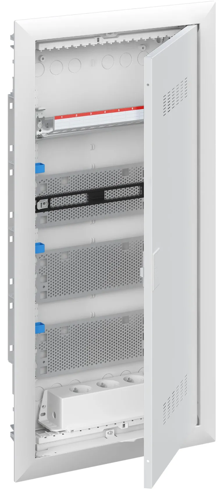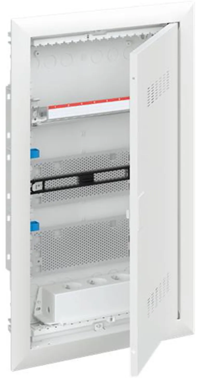 Vakiokeskuskotelo uppoasennukseen, sarjaan ABB UK600, ovikehyksellä ja ovella, kotelointiluokka II (kaksoiseristetty) ja IP30, sovellettavat standardit: EN 60670-24, IK-koodi 07, Nimelliskäyttöjännite 400V AC 50/60 Hz, nimellisvirta 63 A, hehkulangan resistanssi 850°C, jauhemaalattu, RAL 9016, kestomuovinen kotelo, jossa kehys ja ilmastoitu ovi, teräslevyovi, TIP-suljin, oven avauskulma 120 astetta, oven sarana oikealla tai vasemmalla, N/PE ja integroitu kaapelikiinnike.