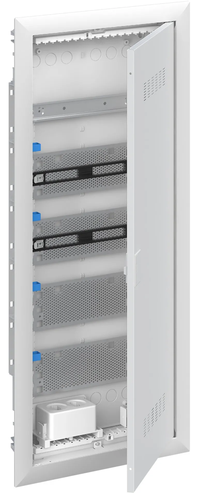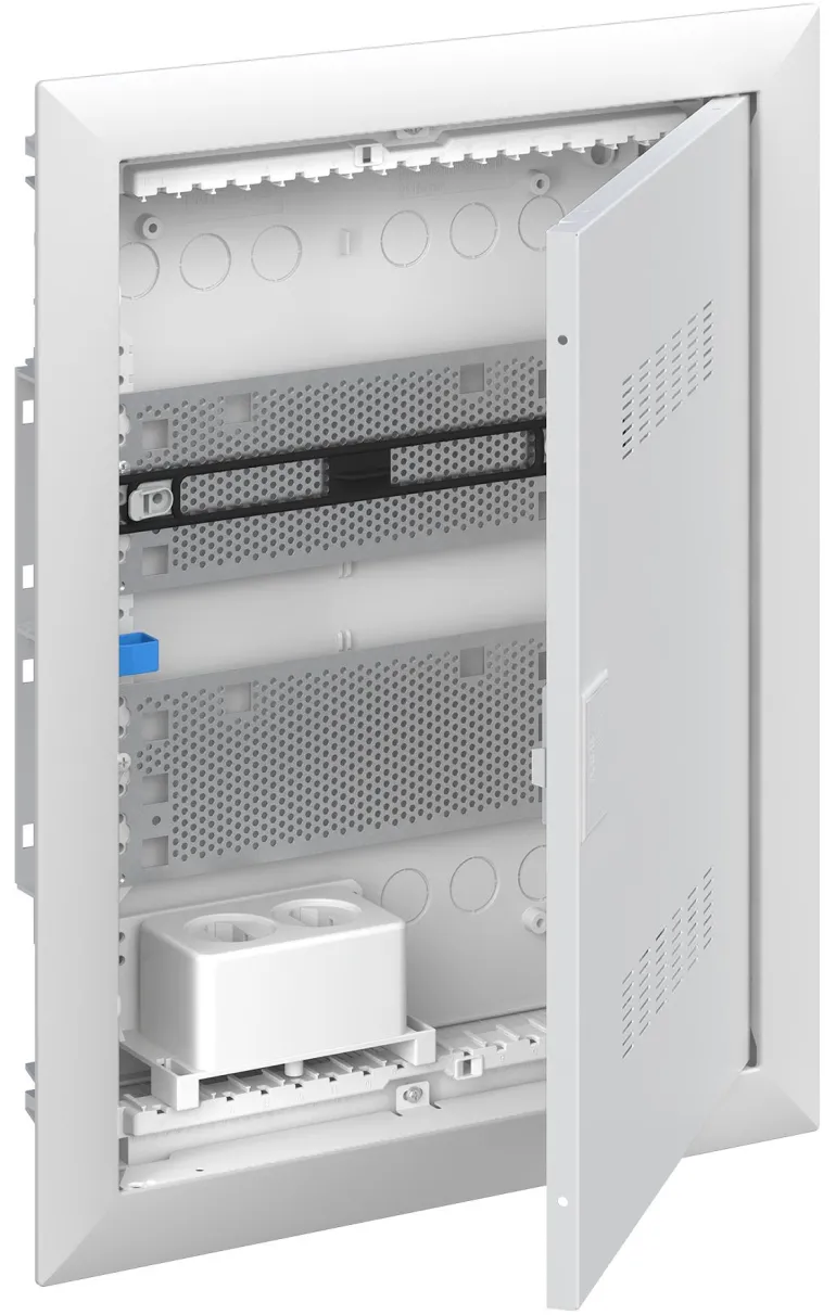Vakiokeskuskotelo uppoasennukseen, sarjaan ABB UK600, ovikehyksellä ja ovella, kotelointiluokka II (kaksoiseristetty) ja IP30, sovellettavat standardit: EN 60670-24, IK-koodi 07, Nimelliskäyttöjännite 400V AC 50/60 Hz, nimellisvirta 63 A, hehkulangan resistanssi 850°C, jauhemaalattu, RAL 9016, kestomuovinen kotelo, jossa kehys ja ilmastoitu ovi, teräslevyovi, TIP-suljin, oven avauskulma 120 astetta, oven sarana oikealla tai vasemmalla, N/PE ja integroitu kaapelikiinnike.