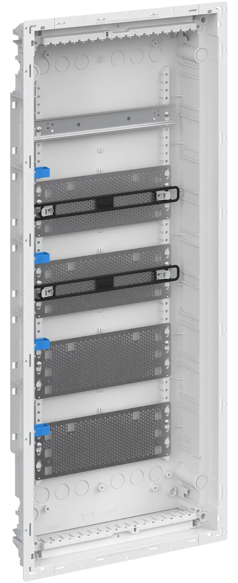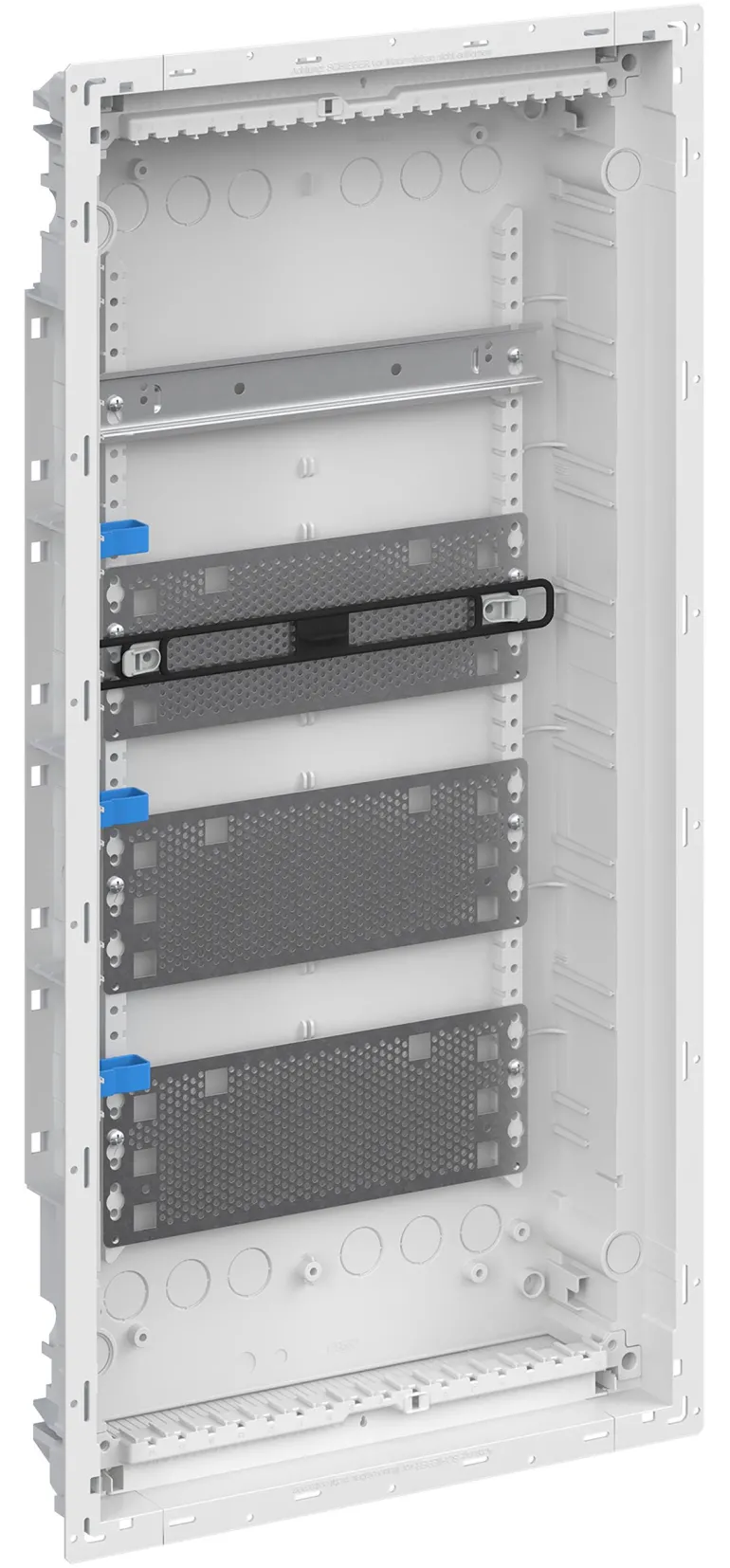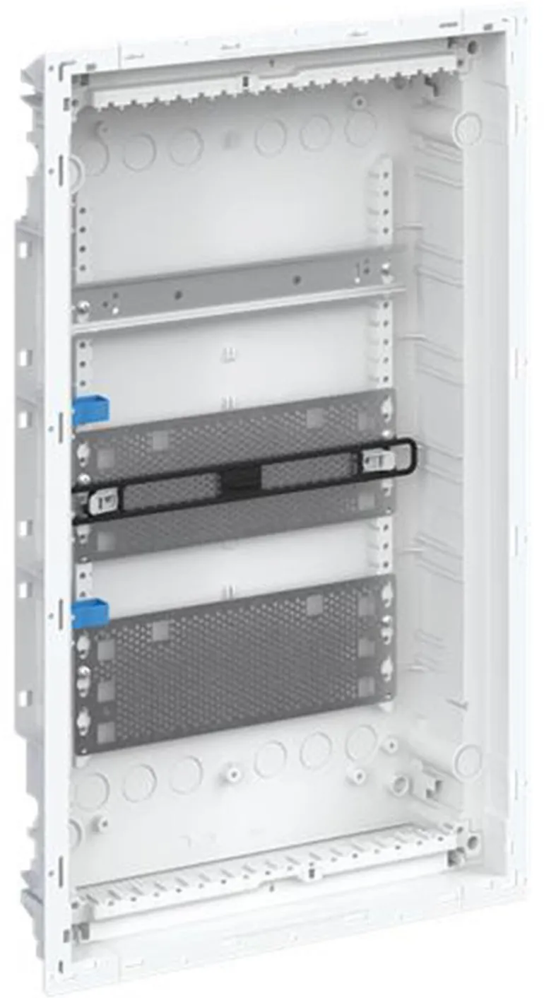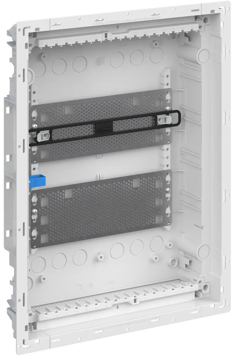 Vakiokeskuskotelo uppoasennukseen, sarjaan ABB UK600, ovikehyksellä ja ovella, kotelointiluokka II (kaksoiseristetty) ja IP30, sovellettavat standardit: EN 60670-24, IK-koodi 07, Nimelliskäyttöjännite 400V AC 50/60 Hz, nimellisvirta 63 A, hehkulangan resistanssi 850°C, jauhemaalattu, RAL 9016, kestomuovinen kotelo, jossa kehys ja ilmastoitu ovi, teräslevyovi, TIP-suljin, oven avauskulma 120 astetta, oven sarana oikealla tai vasemmalla, N/PE ja integroitu kaapelikiinnike.