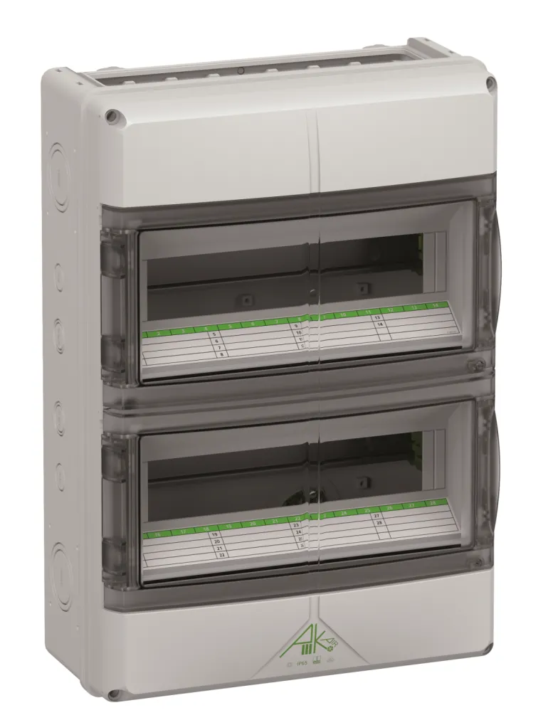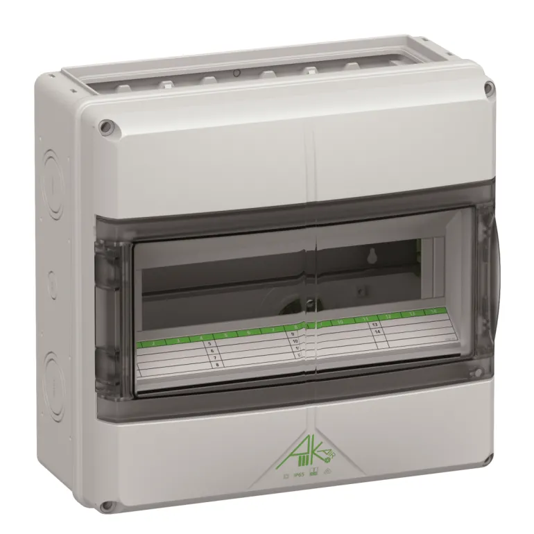 Pinta-asennettava vakiokotelo, jossa on avoimet etusivut, käytettäväksi eri laippojen kanssa. Useiden AK-F-jakajien yhdistämiseen yhdistelmälaipalla. Varustettu 150 mm kiskojen välisellä etäisyydellä ja integroidulla ilmanvaihtoelementillä kondension vähentämiseksi.
