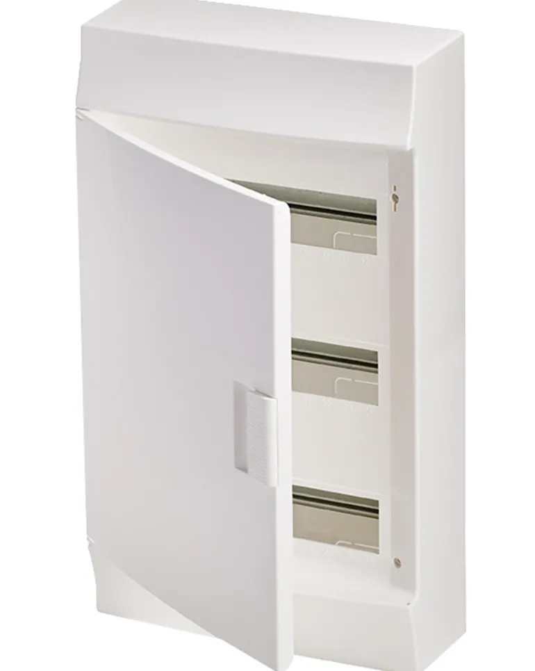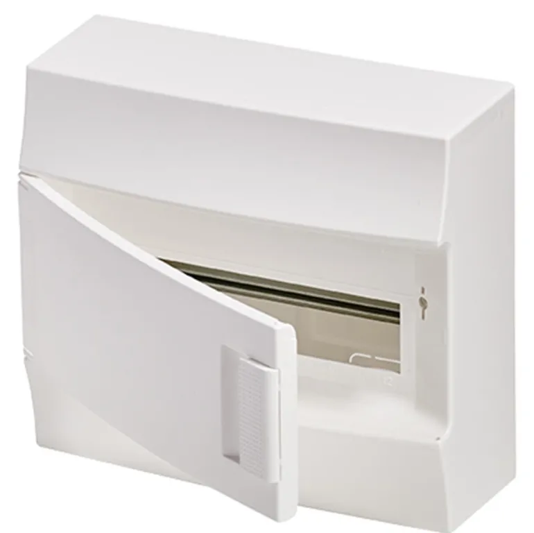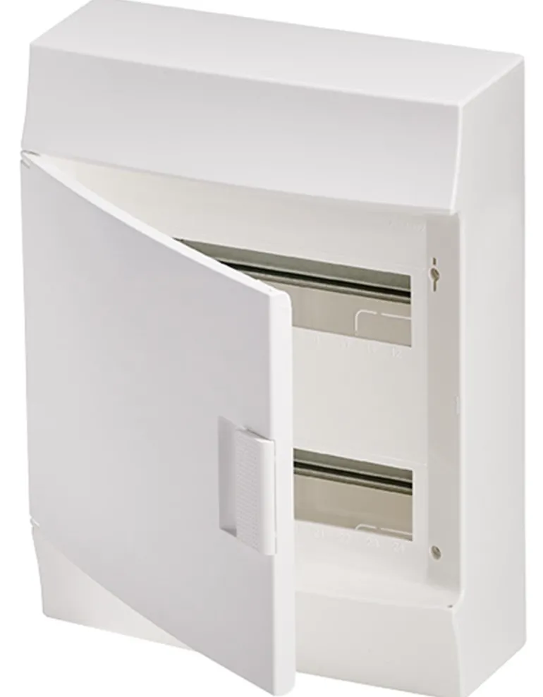 Valkoinen vakiokotelo ovella IP41. N/PE-kiskot pikaliittimellä ovat mukana toisella puolella.