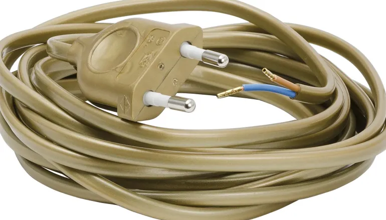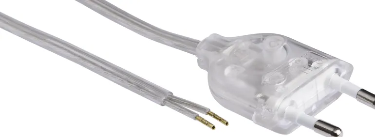 Valaisimen johto EU-pistokkeella ja kuoritulla päällä, mallissa on kaksi johdinta, nimellispinta-ala 0,75 mm². Saatavana värit valkoinen, musta tai kulta.