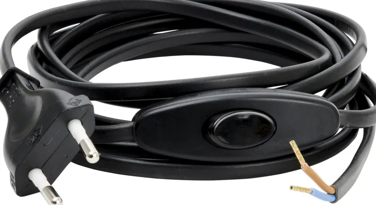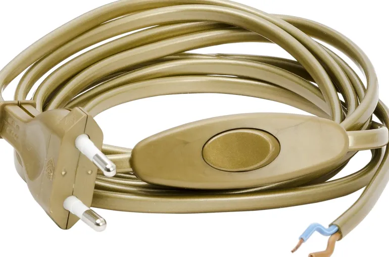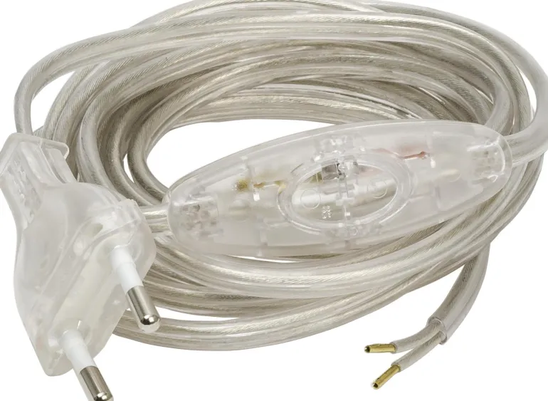 Valaisimen johto, jonka pituus on 2,5 metriä. Kuorittu pää, välikytkin ja EU-pistoke. Kaapelin pituus pistokkeen ja himmentimen välillä on 1,8 metriä.