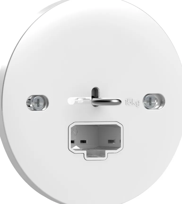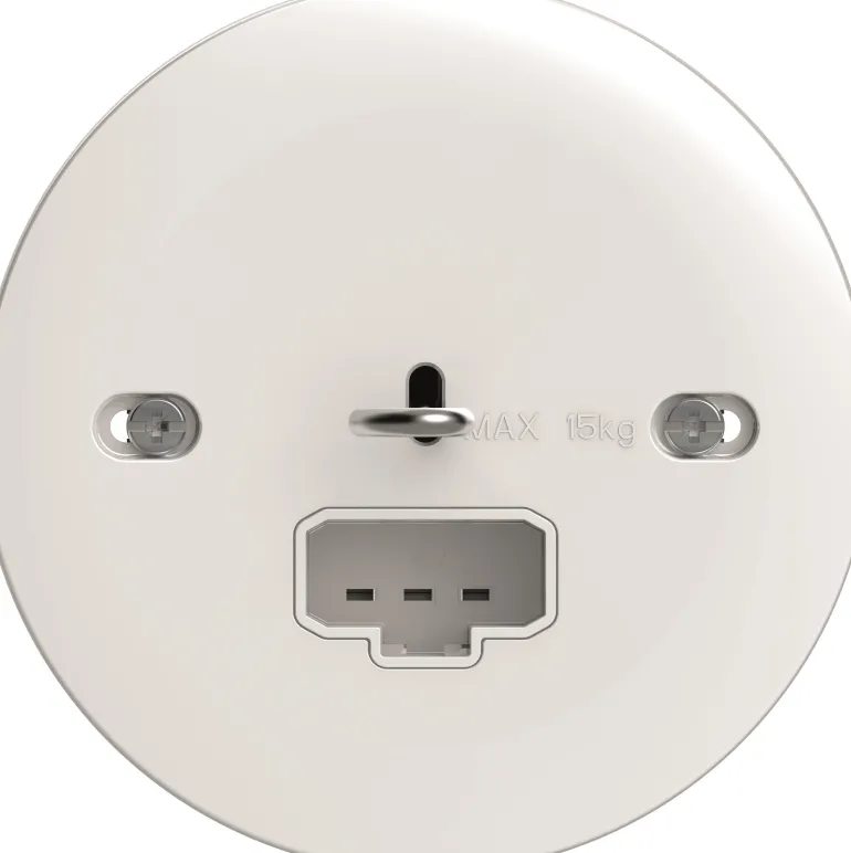 Valaisinpistorasia, DCL, irrotettavalla koukulla. Valaisinpistorasia upotettavaan kattoasennukseen kattorasiaan c/c 70 mm. DCL-liittimen koukun maksimikantavuus on 15 kg, mikä mahdollistaa valaisinten helpon ripustamisen. Kun valaisin asennetaan suoraan kattoon, koukun voi irrottaa helposti, jolloin pinnasta tulee täysin sileä.