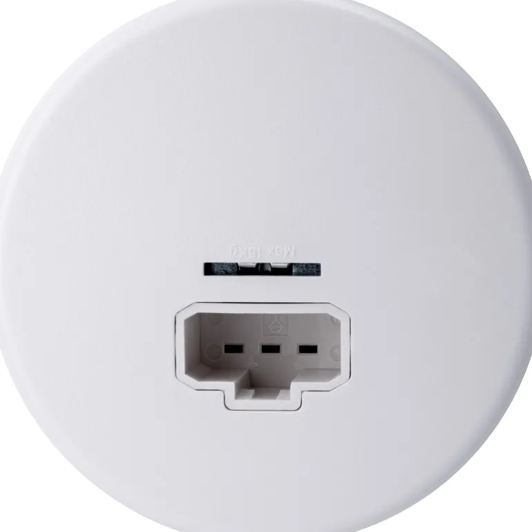 Pyöreä valaisinpistorasia kattoasennukseen. Asennus kattorasiaan c/c 70 mm. Valaisinpistorasiassa on ripustuskoukku, johon kestää enintään 15 kg:n painon. DCL-laitteita tulee käyttää vain maadoitettujen järjestelmien kanssa.