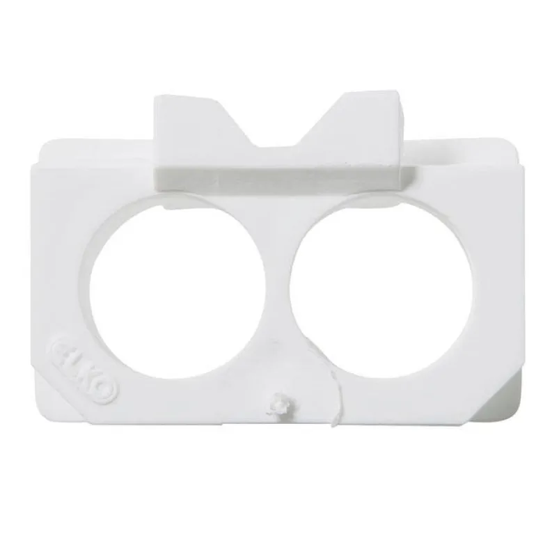 Elko EKO08628 on välikappale koteloitujen, pinta-asennettujen pistorasioiden ja kytkimien kokoamiseen. Siinä on kaksi reikää ja se on tehty valkoisesta termoplastista.