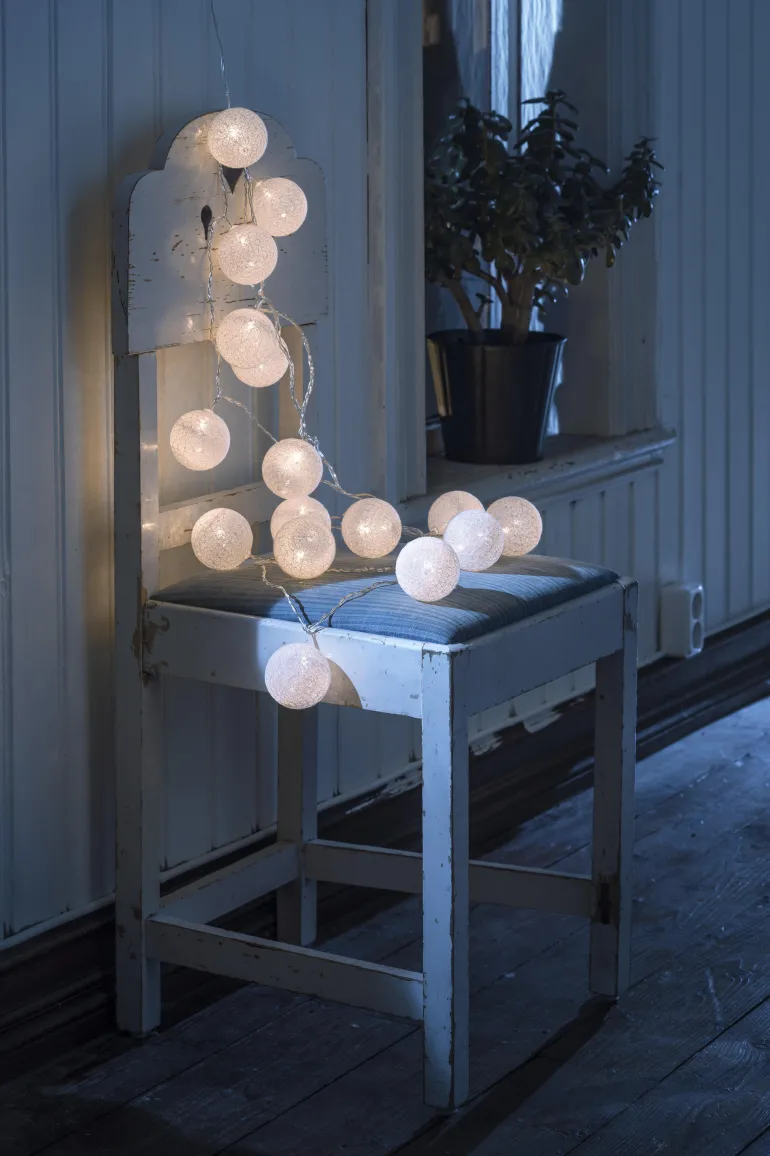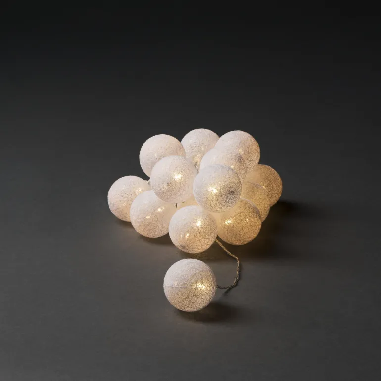 Konstsmide 3134-103 on valosarja 16 valkoisella lankapallolla (6 cm), joissa LEDit. 24V/IP20.