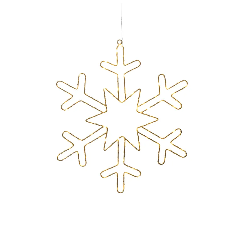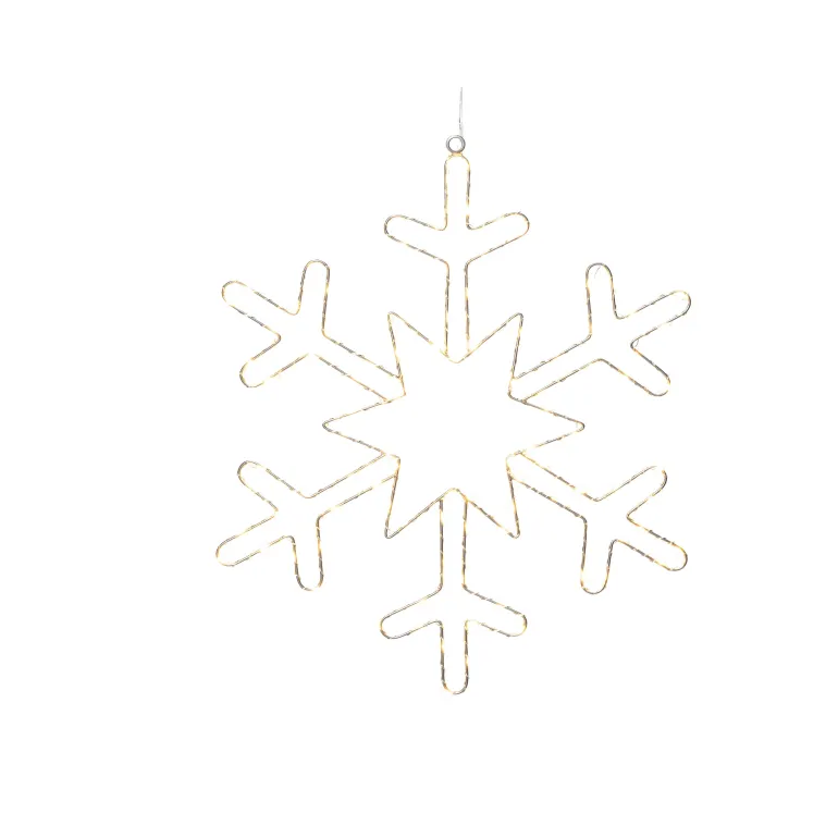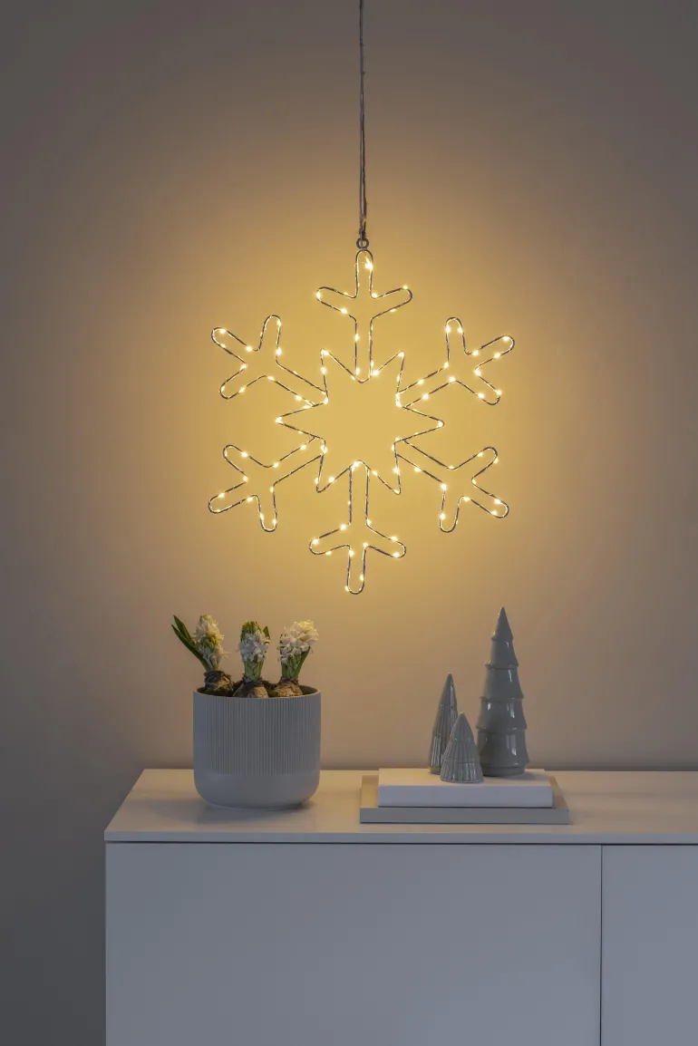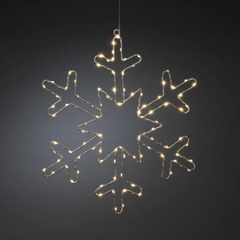 Konstsmide 1803-993 on ripustettava lumihiutaleen muotoinen valokoriste metallia 46 cm (hopea). 100 LEDiä, valon väri amber. 4,5 V/IP20.