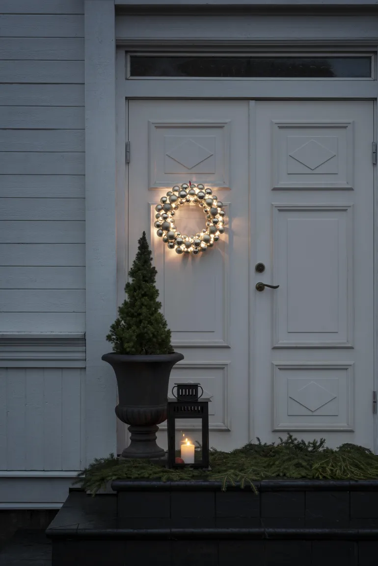 Konstsmide 3783-303 on valokranssi 40 cm (hopea), jossa on 50 lämpimän valkoista LEDiä. Ajastin 9 h, 4 x AA-paristoa.