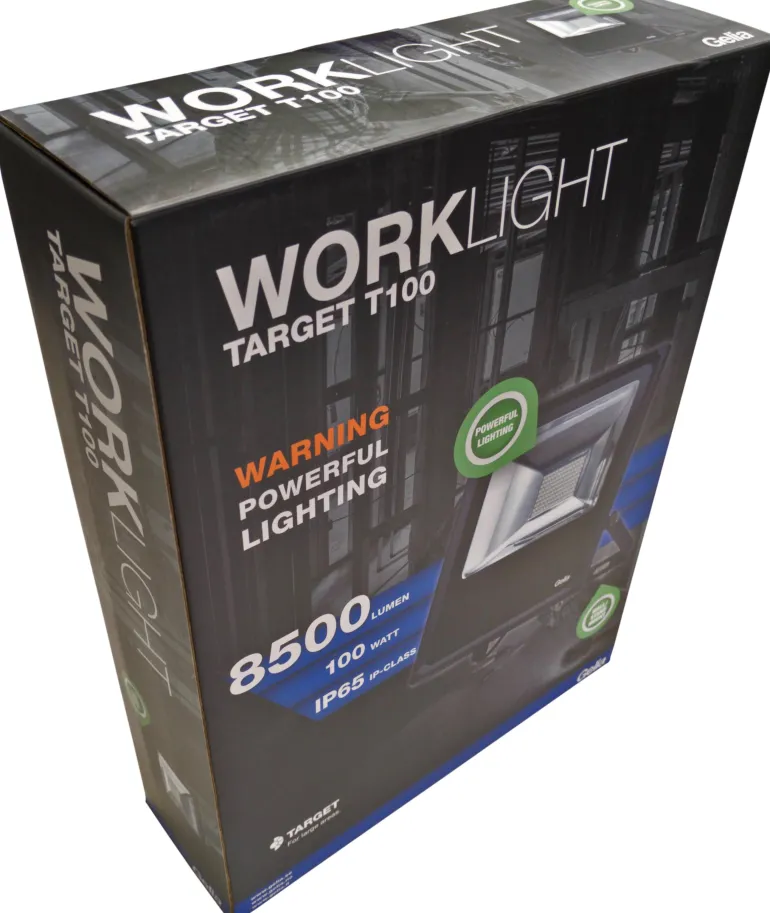 Gelia TARGET T100 on erittäin tehokas työvalaisin, jossa on integroitu LED-valonlähde. LED-valonheitin voidaan sijoittaa suoraan lattialle tai asentaa seinälle tai tolppaan. Käännettävä kiinnike helpottaa valon kohdistamista. Voimakas valo tekee valonheittimestä sopivan suurten alojen, kuten sisäpihojen tai julkisivujen, valaisuun. Mukana 0,5 metrin kaapeli H05RN-F 3G1, jossa on maadoitettu pistotulppa. Korkea suojausluokka IP65 tarkoittaa, että valaisin on pölyn- ja roiskeenkestävä.