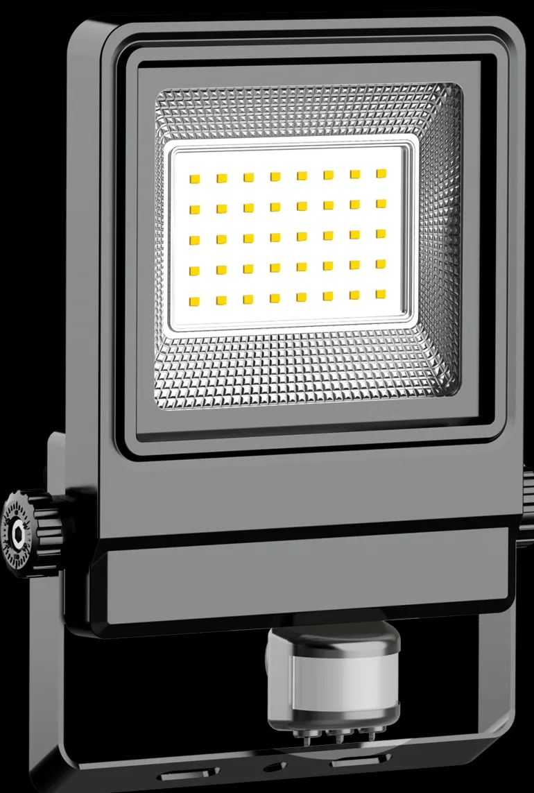 Vesitiivis 30 W LED-valonheitin, joka soveltuu sekä sisä- että ulkokäyttöön. Valaisimessa on integroitu liiketunnistin ja se voidaan helposti kiinnittää säädettävällä kiinnikkeellä seinään tai kattoon.