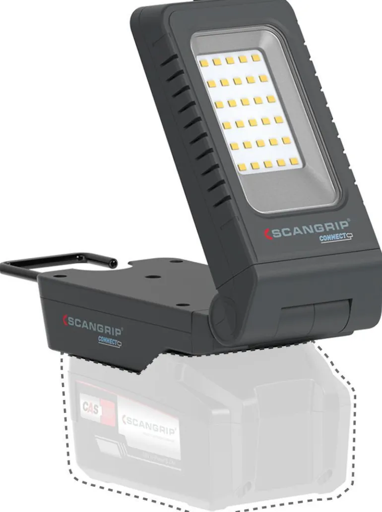 BASIC CONNECT on yhteensopiva METABO / CAS 18 V -akkujärjestelmän sekä kaikkien muiden johtavien sähkötyökalujen valmistajien 18 V/20 V akkujen kanssa SCANGRIP CONNECTOR -sovittimen avulla. Lisäksi valaisin voidaan liittää suoraan verkkovirtaan SCANGRIP POWER SUPPLY -virtalähteen avulla, mikä mahdollistaa jatkuvan virransaannin. Joustava ja kääntyvä valaisimen pää tuo lisäkäyttömahdollisuuksia.