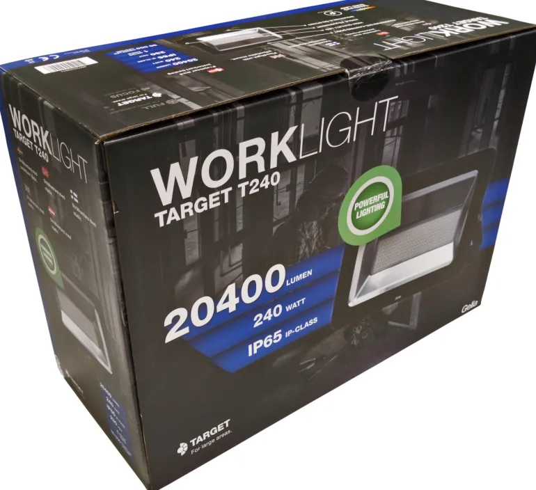 TARGET T240 on erittäin tehokas työvalaisin, jossa on integroitu LED-valonlähde. LED-valonheitin voidaan sijoittaa suoraan lattialle tai asentaa seinälle tai tolppaan.