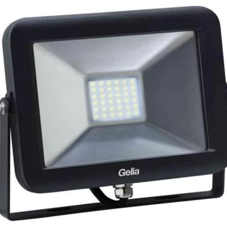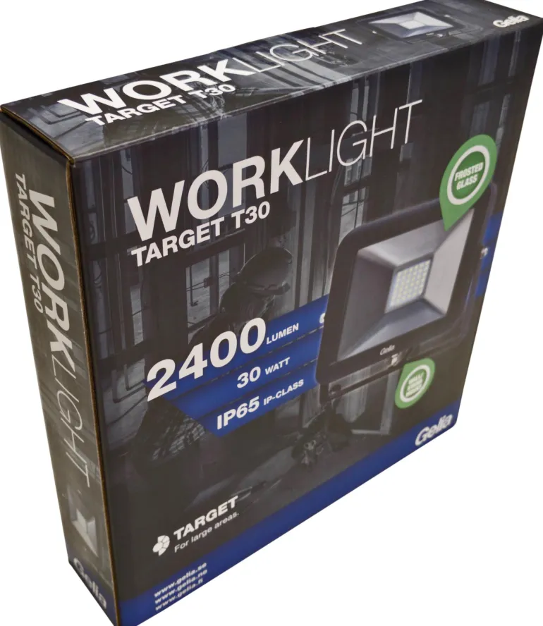 Gelia TARGET T30 on ohut LED-valonheitin, jossa on huurrelasi, joka torjuu häikäisevää valoa. Työvalaisimessa on kulmakannatin, ja se voidaan asentaa seinälle tai telineeseen. Mukana 0,5 m:n kaapeli H05RN-F 3G1.0, jossa on maadoitettu pistotulppa. Suojausluokka IP65.