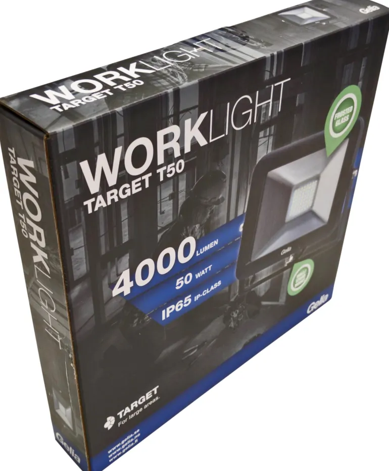 TARGET T50 on ohut LED-valonheitin, jossa on huurrelasi, joka torjuu häikäisevää valoa. Työvalaisimessa on kulmakannatin, ja se voidaan asentaa seinälle tai telineeseen.