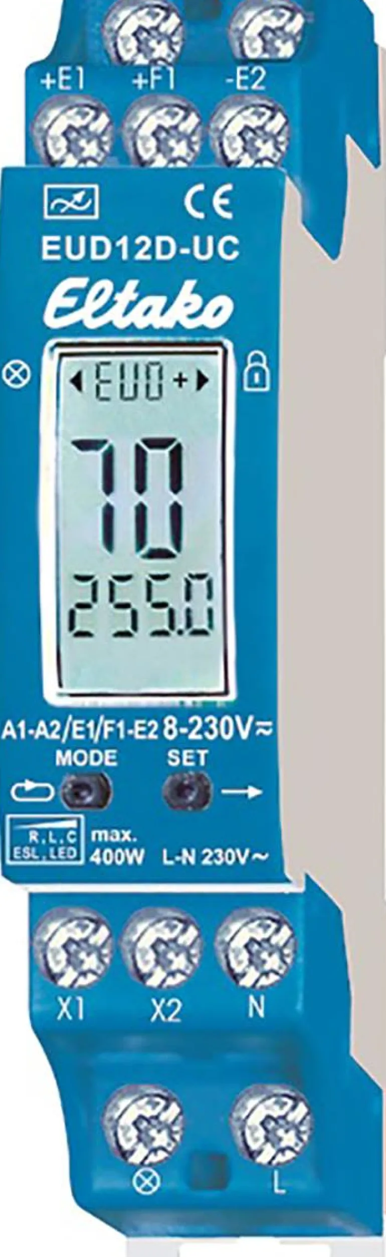 DIN-asennukseen tarkoitettu painesäädin, vain 1 moduulin levyinen, mikä tarkoittaa joustavaa asennusta vakiokoteloon. Monitoiminäytöllä EUD = yleisvalonsäätö. ESV = Samat toiminnot kuin EUD, mutta lisänä virrankatkaisuviive, tätä voidaan säätää 1-90 minuutin välillä, jos manuaalista OFF-signaalia ei anneta, virrankatkaisuvaroituksen himmennysnopeutta voidaan säätää 1-3 minuutin välillä.