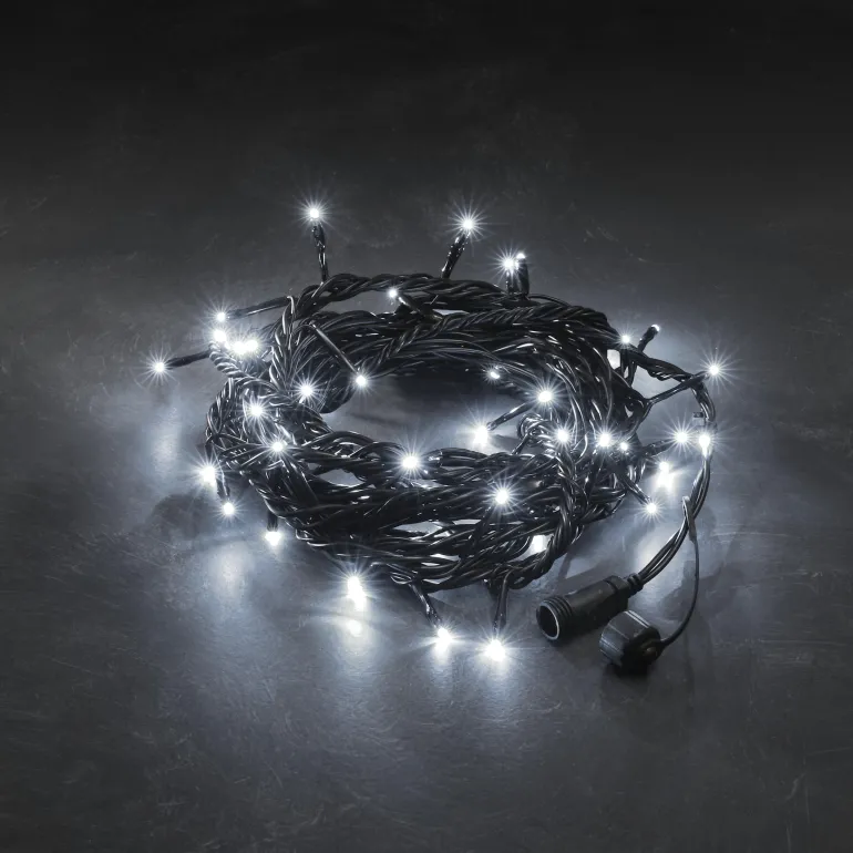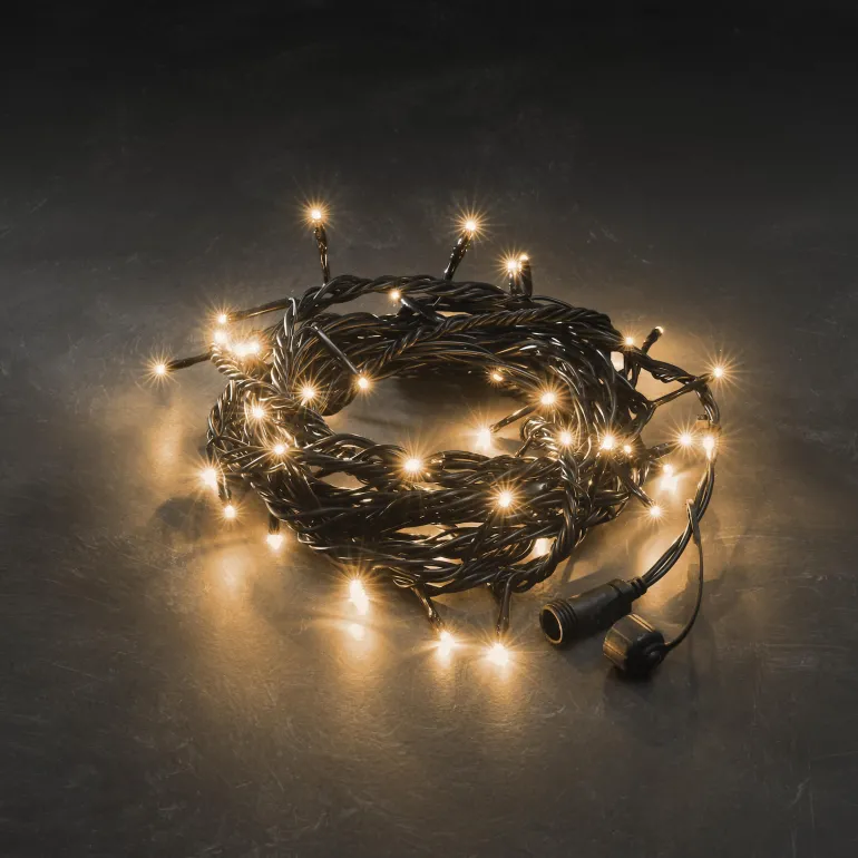 Konstsmide 4850-807 on valosarja, jossa on 50 LEDiä (valon väri amber). Musta pehmeä kaapeli, 31V/IP44.