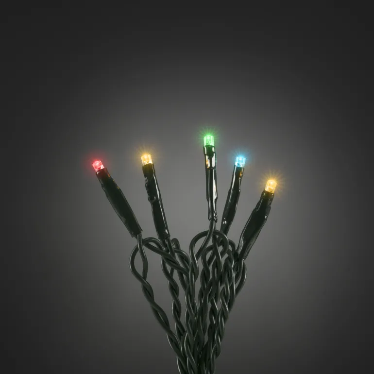 Konstsmide 6352-520 on valosarja, jossa on 35 moniväristä LEDiä. Tummanvihreä kaapeli, 24V/IP20.
