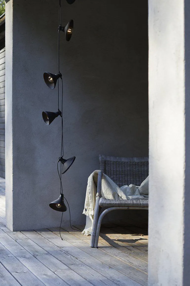 Daphne -valosarja metallisilla varjostimilla (musta mattapinta). Varjostimet ovat erimuotoisia, mikä luo kiinnostavan vaikutelman. Valosarja sisältää 6 kiinteää LED-lamppua varjostimilla. Soveltuu ulkokäyttöön (IP44-luokitus), mutta voidaan ripustaa myös sisätiloihin. Kokonaispituus on 7,2 m: 3 m ensimmäiseen lamppuun ja sitten 0,7 m lamppujen välillä. Valonlähteet eivät ole vaihdettavissa.
