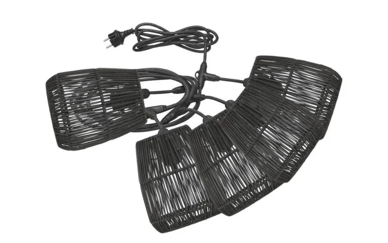 Flex Out -valosarja (IP44) 5 x E27-lampunpitimellä (maks. 15W) ja varjostimella. Kokonaispituus 6,5 m, 2,5 m ensimmäiseen lampunpitimeen, sitten 80 cm kunkin lampunpitimen välillä. Etäisyys alas varjostimeen 15 cm. 5 kpl Saigon -varjostimia polyrottingista. Varjostimien leveys 18 cm ja korkeus 20 cm.