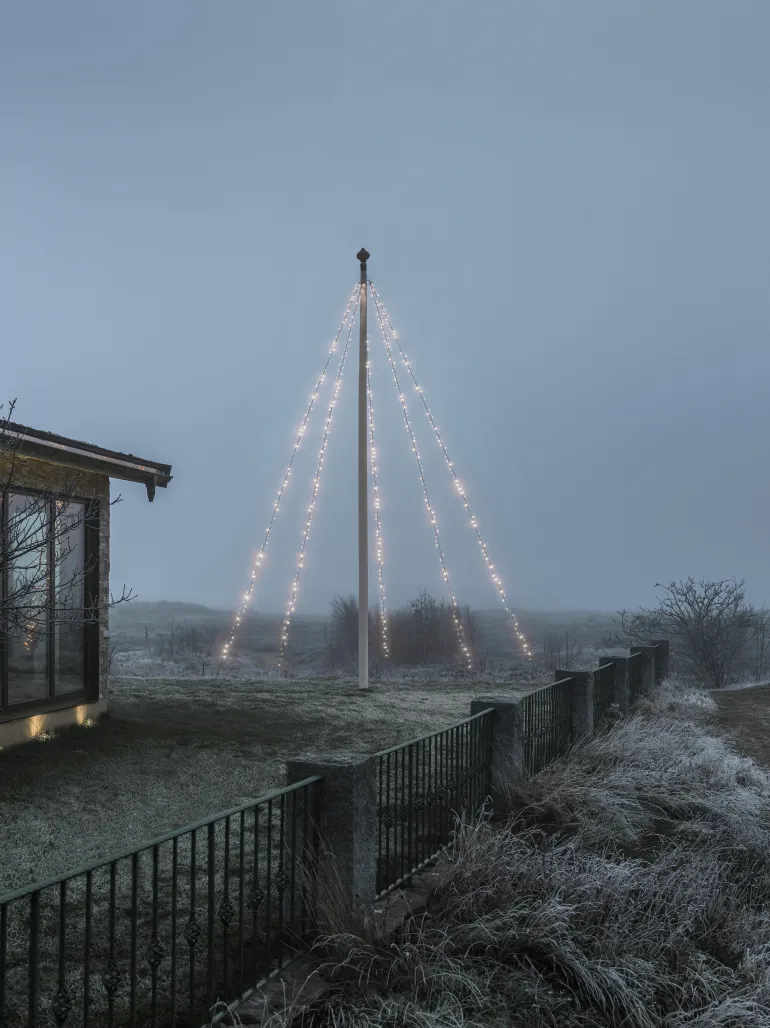 Konstsmide 4782-137 on valosarja lipputankoon, jossa lämpimän valkoiset LEDit (5×100, huurrettu). Musta pehmeä johto. 24V/IP44.