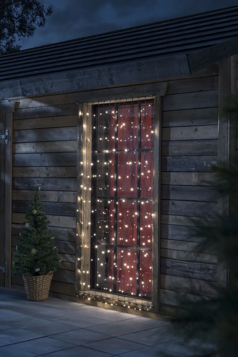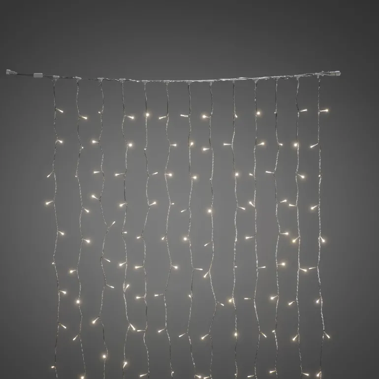 Konstsmide 4825-107 on valoverho, jossa on 208 lämpimän valkoista LEDiä. Musta pehmeä johto, 31V/IP44.