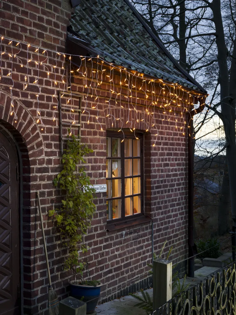 Konstsmide 2761-802 on valosarja, jossa on 200 LEDiä (valon väri amber). Valkoinen johto 31V/IP44.