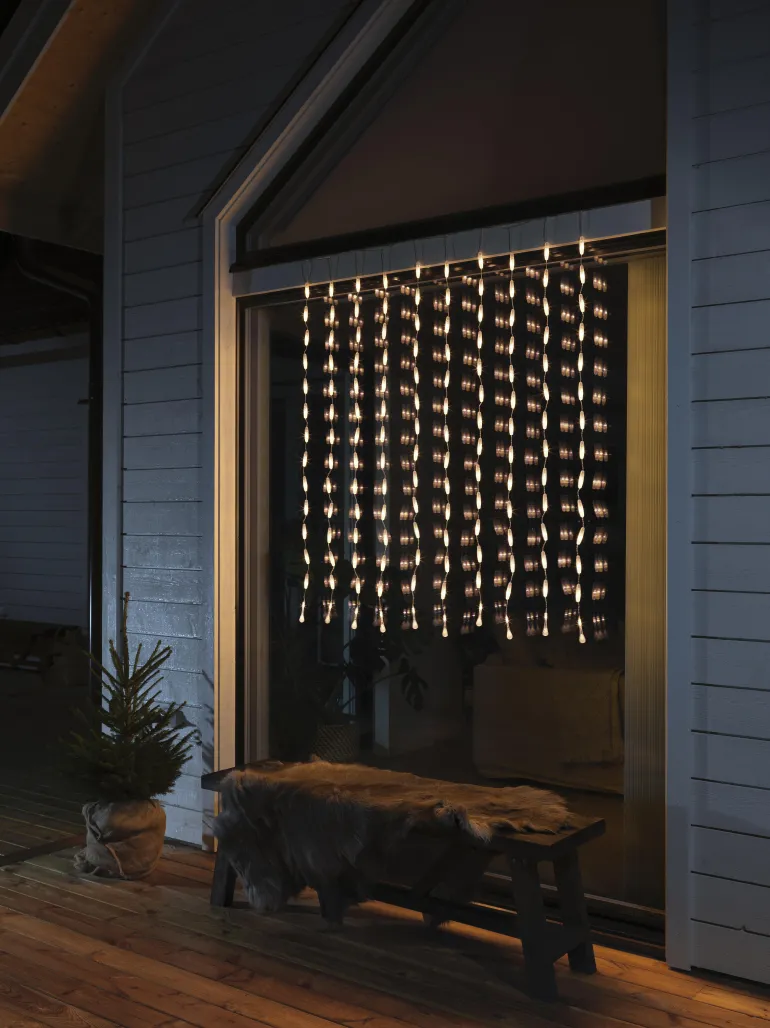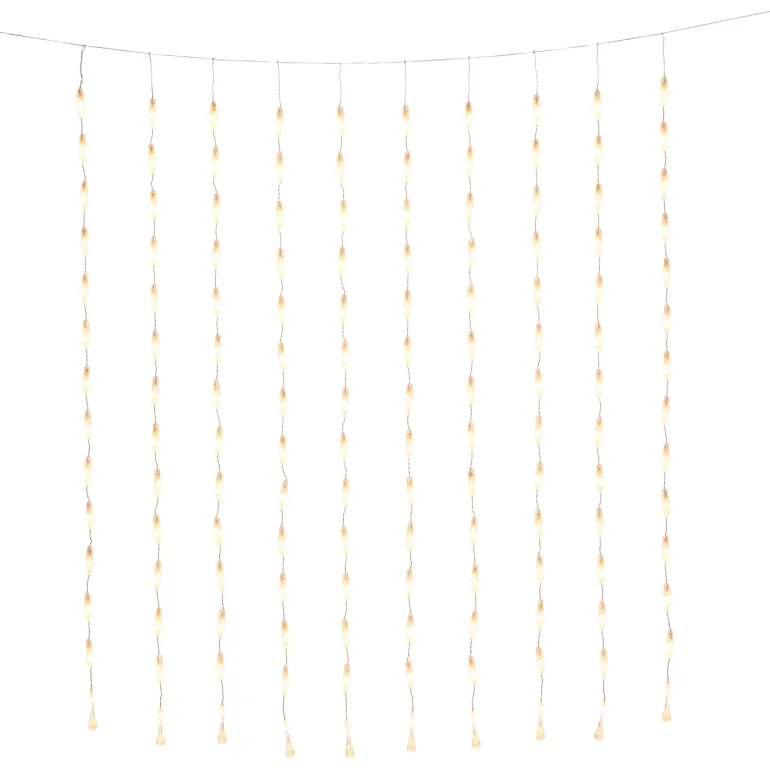 Konstsmide 4051-803 on valosarja, jossa on 140 LEDiä (pisaramuoto, valon väri amber), 140×120 cm. 30V/IP44.