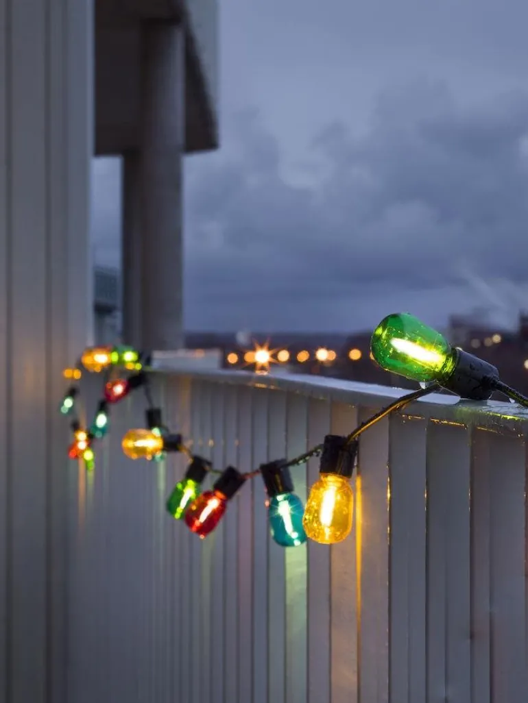 Valosarja, jossa 20 pienempää lamppua E14-kannalla. Lamput ovat keltaisia vihreitä, punaisia ja sinisiä.