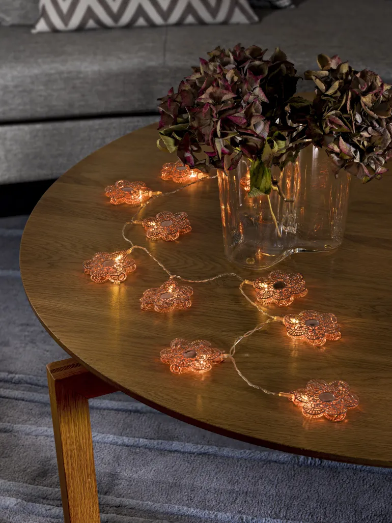 Konstsmide 3144-603 on valosarja 10 metallisella kukalla (kupari). Lämmin valkoinen LED. 3xAA.