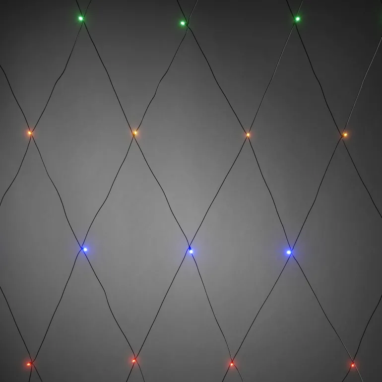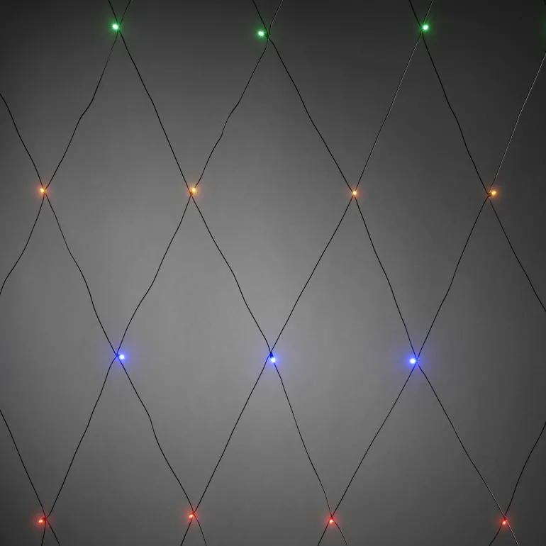Konstsmide 3749-500 on valoverkko, jossa on 64 LEDiä eri väreissä. 2×2 m, musta verkko/johto.