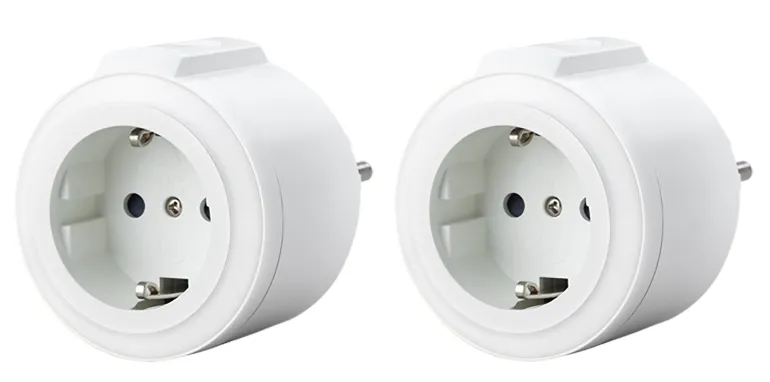 2 kappaleen pakkaus Plug-in-vastaanottimia, jotka kytketään pistorasiaan ja ohjataan langattomasti kaukosäätimellä. Kosketussuojattu.
