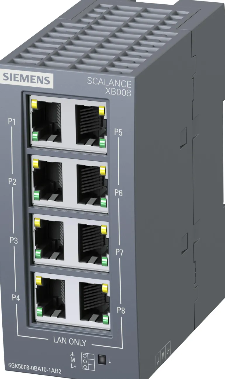 Scalance XB008 8XRJ45 on teollinen verkkokytkin pieniin tähti- tai väylärakenteisiin verkkoihin, joita voidaan kytkeä koneisiin tai tuotantolaitoksen osastoihin. Kytkimessä on 8 RJ45-porttia päätelaitteiden tai muiden verkkosegmenttien liittämiseen.