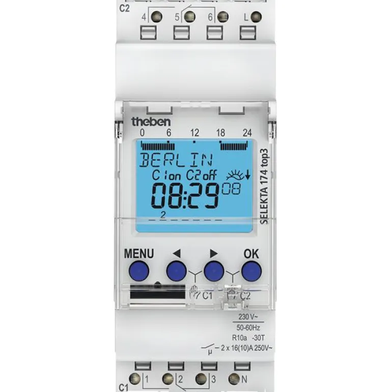 SELECTA 174 Top3:n minimikytkentäkapasiteetti on noin 10 mA. Asennetaan DIN-kiskoon. Varustettu LCD-näytöllä ja käyttöpainikkeella pistokkeen irrottamiseksi. Sijaintitiedot voidaan ohjelmoida koordinaattien tai maa-kaupunkiluettelon kautta ja huoltotoiminto mahdollistaa huoltovälien seurannan. Maksimaalinen suoja peukalointia vastaan, aikakytkentäohjelmat voidaan siirtää sovelluksesta kelloon vain Bluetooth-yhteyden avulla. Eri maiden siirtymäsäännöt on jo tallennettu. Omat siirtymäsäännöt tai vaihdot tehdään asetuksista.