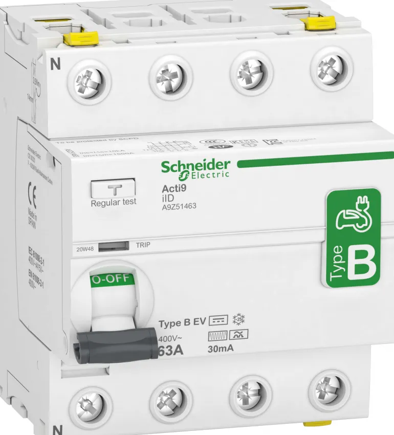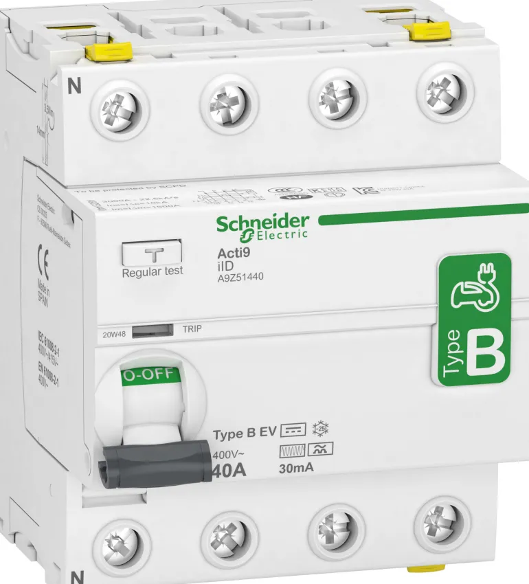 Schneider Electric Acti 9 iID on 4-napainen B-EV-tyyppin vikavirtasuoja, jonka nimellinen vikavirta on 40A, 30mA. Käytetään sovelluksissa, joissa käytetään autolaturia, koska tasavirtaa voi esiintyä. B-EV tarkoittaa sähköautoa ja se on kehitetty erityisesti sähköautojen lataamista varten. Jos sähköauton laturissa ei ole sisäänrakennettua tasavirtasuojaa, se on suojattava B-tyypin vikavirtasuojalla. Nimellisjännite 230 V, 50 Hz. Standardit: IEC/EN 61008-2-1, IEC/EN 62423, IEC 61543, VDE 0664.