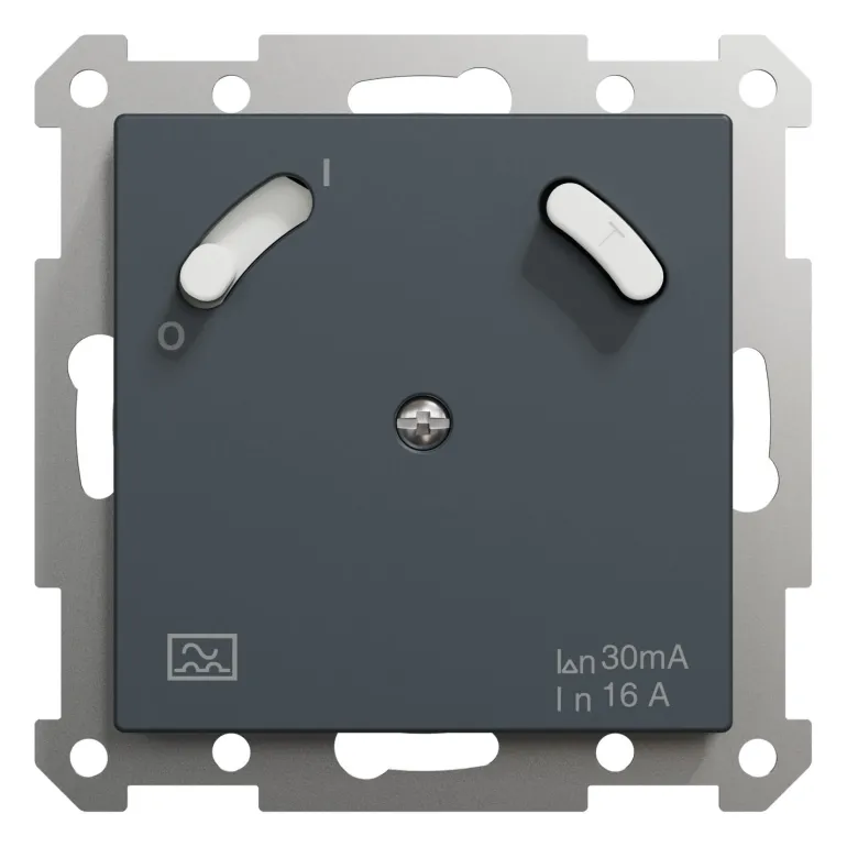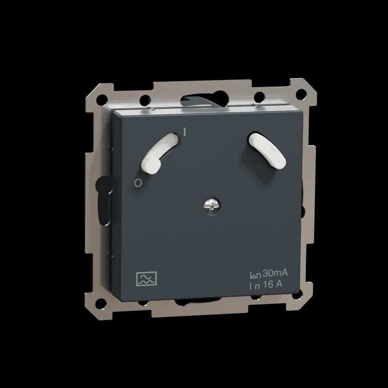 Exxact -vikavirtasuojakytkin ANT, 16A. ON/OFF -kytkimellä ja testipainikkeella. Tyyppi A versio, 30 mA. Uppokojerasiaan c/c 60 mm tai 35 mm syvään pintakojerasiaan. Jousiliitin. Täydennetään valinnaisella Exxact-kehyksellä.