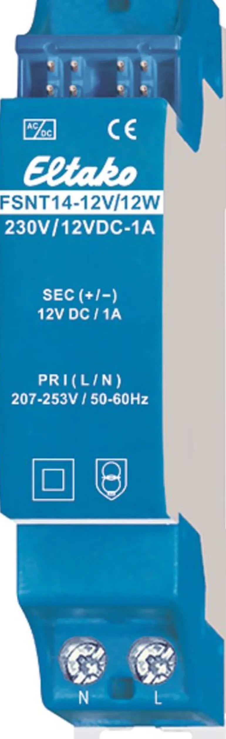 Verkkovirtalähde 12W. Pikaliitännällä Eltako RS485BUS, virransyöttöön asennuksissa, joissa tarvitaan lisää tehoa johtuen tekijöiden määrästä, joka ylittää maksimitehon FAM14: ssä, tai FSM14-UC:n virransyöttöön. Pikaliittimet TB14, 1,5 moduulit ja välike DS14 toimitetaan tehtaalta.