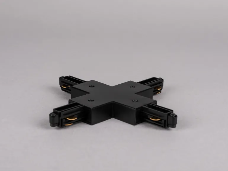 Musta X-liitäntä. Liitäntä on osa monipuolista kiskojärjestelmää Focus- ja Comfort-sarjan yksivaiheisille Hide-a-lite-tuotteille, joissa kukin osa myydään erikseen tarpeisiisi sopivana sekä kotiin että julkisiin tiloihin.