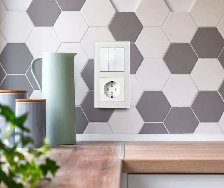 Plus Option on sarja metalli-, lasi- ja liuskekiviyhdistelmäkehyksiä upotettaville kytkimille, seinäpistorasioille jne.