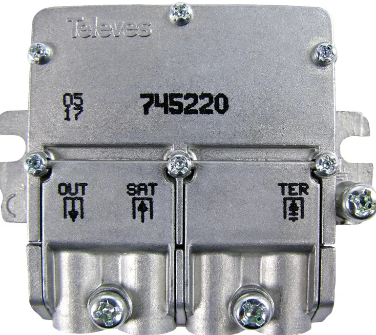 Mukana suodatin, viite: Tuotteella 745220 voi yhdistää satelliittilautasen signaalit tavallisten maanpäällisten televisioantennien signaaleihin. Asennus on usein helpompaa, kun voidaan käyttää olemassa olevia kaapelikotelon yleisantenneja.