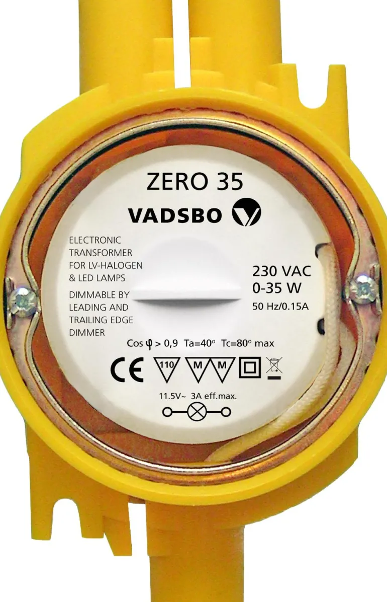 Vadsbo ZERO 35 on rasiamuotoinen yleishimmenninmuuntaja, joka sopii kojerasiaan, mikä helpottaa asennustyötä. Yhdistelmä LD 220 (13 774 40) + ZERO, 0 watin muuntajia – Du0TM – luo ainutlaatuisen profiilin 12 VAC LED-lamppujen vaihekulman säätöön. Tuloksena on, että 100 % himmennettävistä 12 VAC LED-valoista ja 99 % ei-himmennettävistä 12 VAC LED-lampuista saa himmennettyä erinomaisesti. Täydellinen mahdollisuus vaihtaa halogeenivalaisimen lamput LED-lamppuihin tulevaisuudessa ja silti saada virheetön himmennysteho.