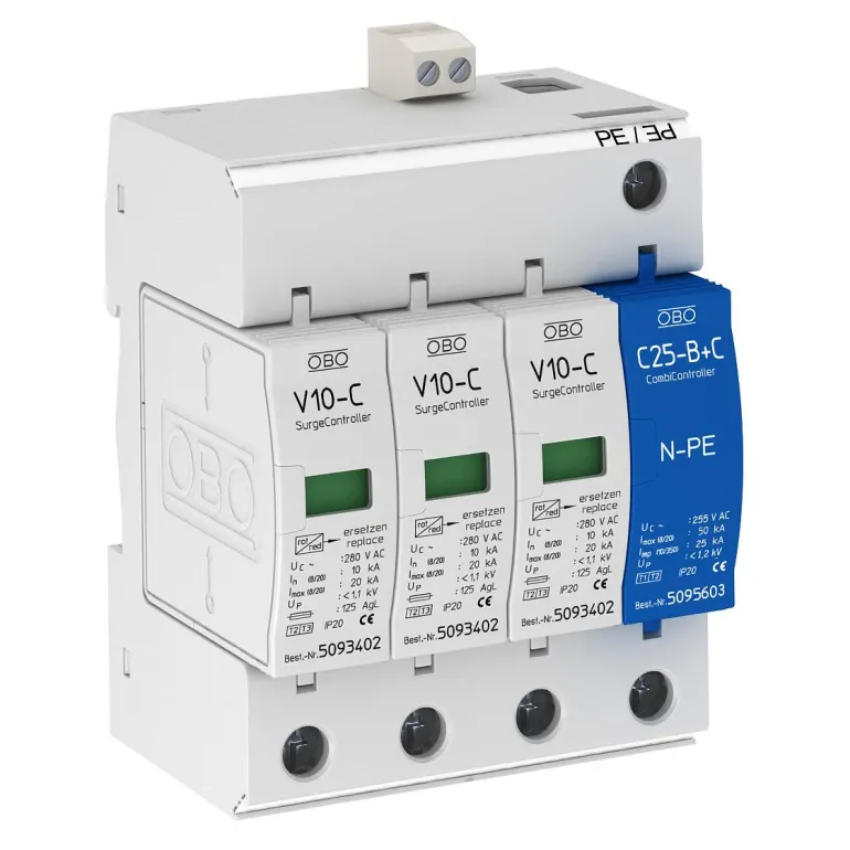 Ylijännitesuoja, tyyppi 2+3, 3-napainen + NPE etäsignaalilla, käytetään potentiaalin tasaamiseen ja yksikön suojaamiseen pää- ja ala-asemissa.